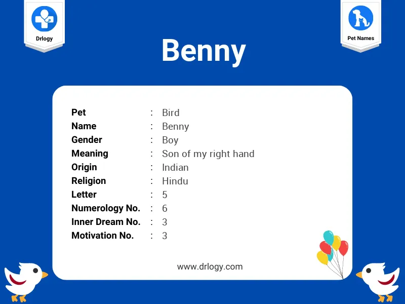 Meaning of Benny is Son of my right hand. Benny is Pet Boy name. Numerology details of Benny name is Numerology Number 6, Motivation Number 3, Inner Dream Number 3, Soul Urge Number 3, Heart's Desire Number 3 & The letter in Benny name is 5. Number of Consonants 3.