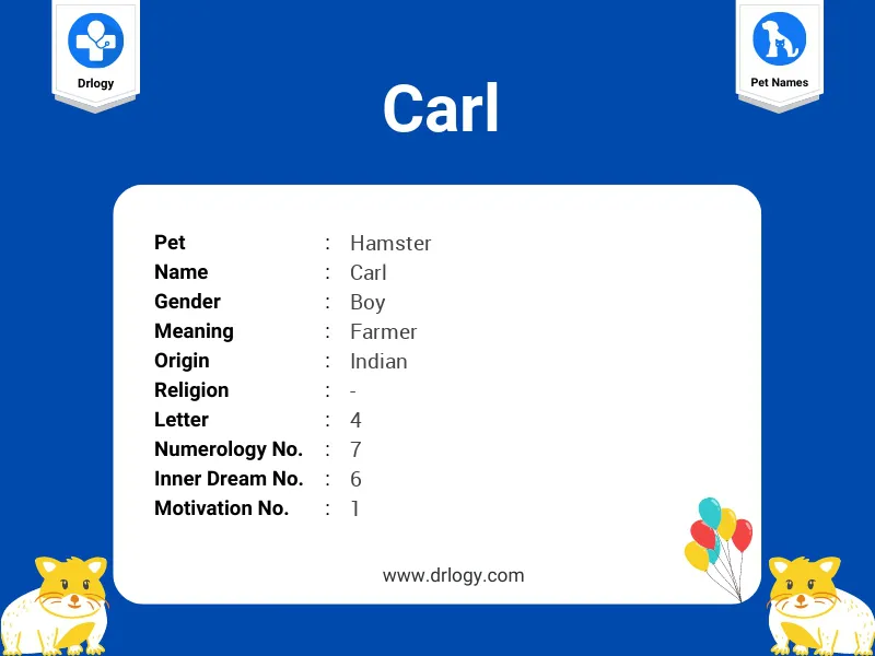 Meaning of Carl is Farmer. Carl is Pet Boy name. Numerology details of Carl name is Numerology Number 7, Motivation Number 1, Inner Dream Number 6, Soul Urge Number 1, Heart's Desire Number 1 & The letter in Carl name is 4. Number of Consonants 6.
