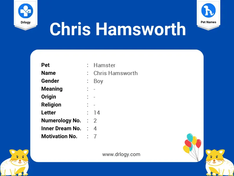 Chris Hamsworth is Pet Boy name. Numerology details of Chris Hamsworth name is Numerology Number 2, Motivation Number 7, Inner Dream Number 4, Soul Urge Number 7, Heart's Desire Number 7 & The letter in Chris Hamsworth name is 14. Number of Consonants 4.