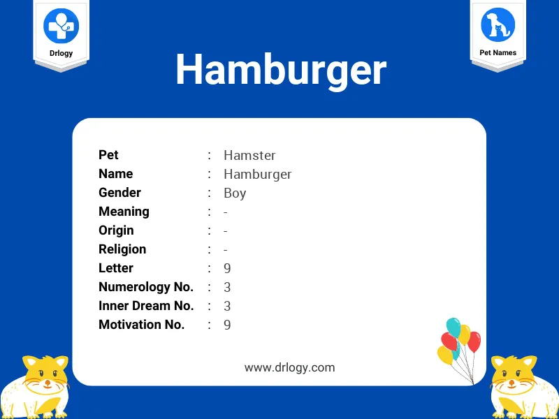 Hamburger is Pet Boy name. Numerology details of Hamburger name is Numerology Number 3, Motivation Number 9, Inner Dream Number 3, Soul Urge Number 9, Heart's Desire Number 9 & The letter in Hamburger name is 9. Number of Consonants 3.