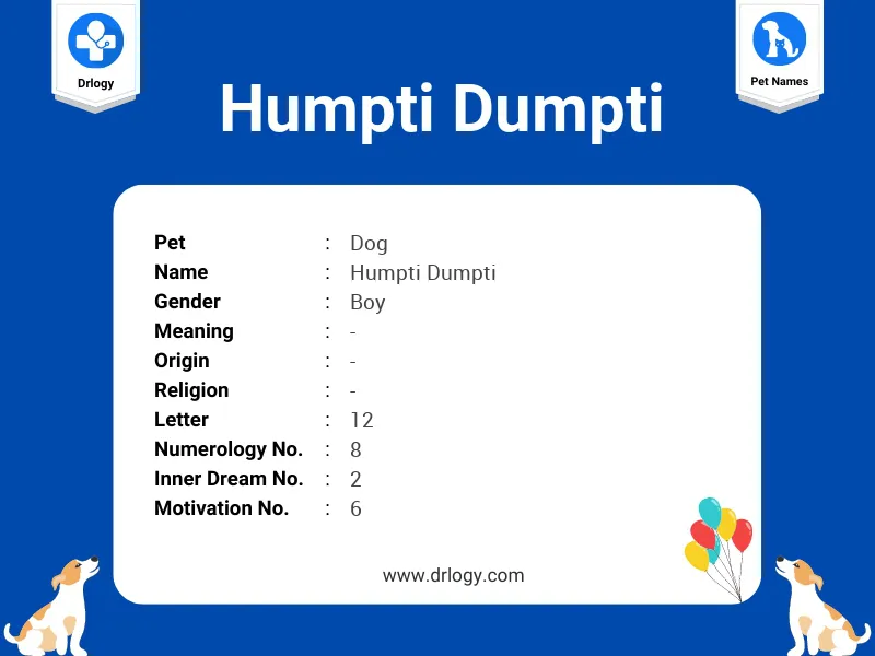 Humpti Dumpti is Pet Boy name. Numerology details of Humpti Dumpti name is Numerology Number 8, Motivation Number 6, Inner Dream Number 2, Soul Urge Number 6, Heart's Desire Number 6 & The letter in Humpti Dumpti name is 12. Number of Consonants 2.