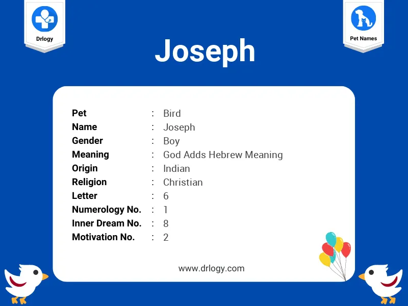 Meaning of Joseph is God Adds Hebrew Meaning. Joseph is Pet Boy name. Numerology details of Joseph name is Numerology Number 1, Motivation Number 2, Inner Dream Number 8, Soul Urge Number 2, Heart's Desire Number 2 & The letter in Joseph name is 6. Number of Consonants 8.