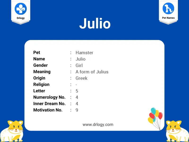 Meaning of Julio is A form of Julius. Julio is Pet Girl name. Numerology details of Julio name is Numerology Number 4, Motivation Number 9, Inner Dream Number 4, Soul Urge Number 9, Heart's Desire Number 9 & The letter in Julio name is 5. Number of Consonants 4.