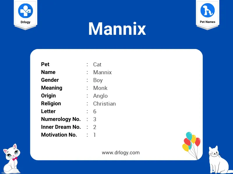 Meaning of Mannix is Monk. Mannix is Pet Boy name. Numerology details of Mannix name is Numerology Number 3, Motivation Number 1, Inner Dream Number 2, Soul Urge Number 1, Heart's Desire Number 1 & The letter in Mannix name is 6. Number of Consonants 2.