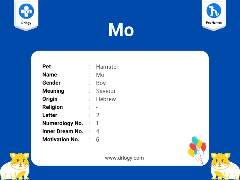 Meaning of Mo is Saviour. Mo is Pet Boy name. Numerology details of Mo name is Numerology Number 1, Motivation Number 6, Inner Dream Number 4, Soul Urge Number 6, Heart's Desire Number 6 & The letter in Mo name is 2. Number of Consonants 4.