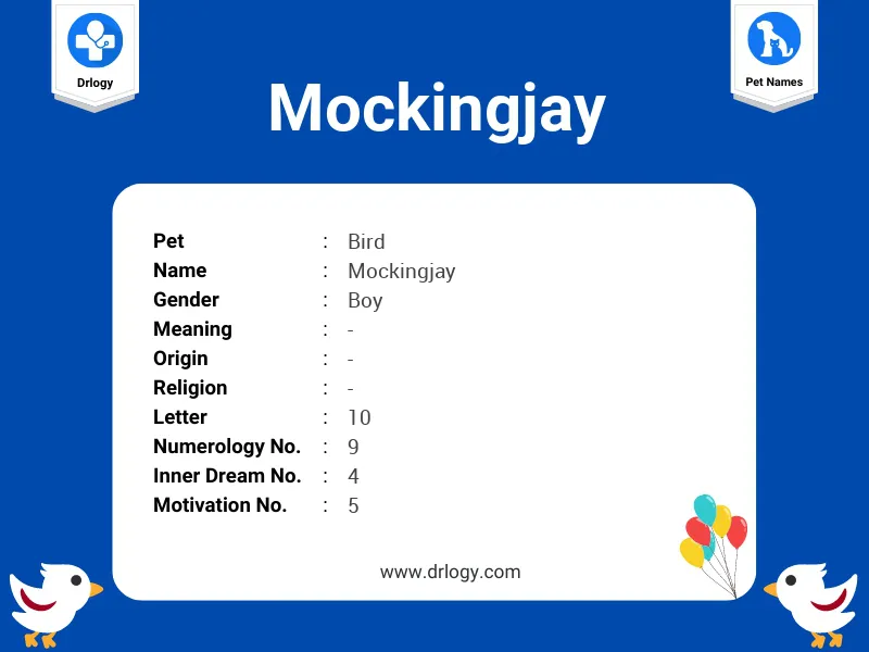 Mockingjay is Pet Boy name. Numerology details of Mockingjay name is Numerology Number 9, Motivation Number 5, Inner Dream Number 4, Soul Urge Number 5, Heart's Desire Number 5 & The letter in Mockingjay name is 10. Number of Consonants 4.