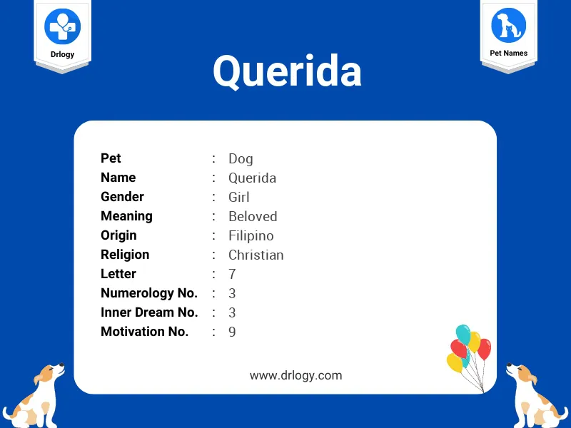 Meaning of Querida is Beloved. Querida is Pet Girl name. Numerology details of Querida name is Numerology Number 3, Motivation Number 9, Inner Dream Number 3, Soul Urge Number 9, Heart's Desire Number 9 & The letter in Querida name is 7. Number of Consonants 3.