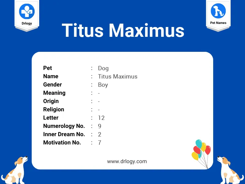 Titus Maximus is Pet Boy name. Numerology details of Titus Maximus name is Numerology Number 9, Motivation Number 7, Inner Dream Number 2, Soul Urge Number 7, Heart's Desire Number 7 & The letter in Titus Maximus name is 12. Number of Consonants 2.