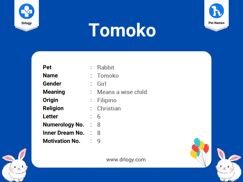 Meaning of Tomoko is Means a wise child. Tomoko is Pet Girl name. Numerology details of Tomoko name is Numerology Number 8, Motivation Number 9, Inner Dream Number 8, Soul Urge Number 9, Heart's Desire Number 9 & The letter in Tomoko name is 6. Number of Consonants 8.